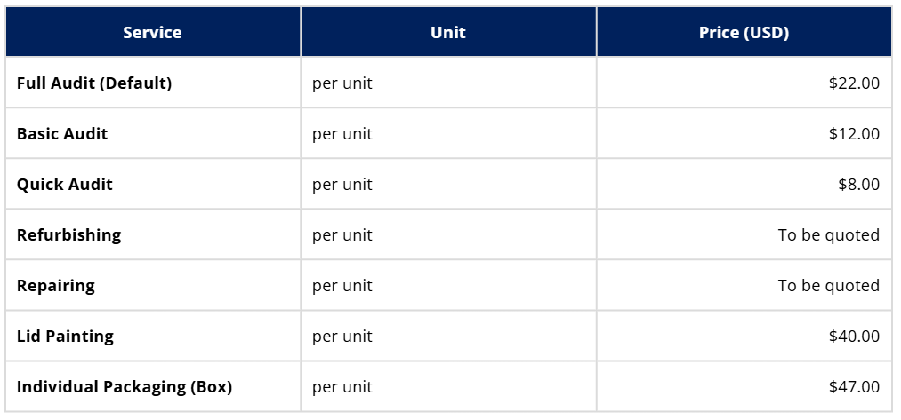 Excludes: Functional testing, data wiping, factory reset, subcomponent recording, Serial Numbers, Cosmetic issues / acceptability